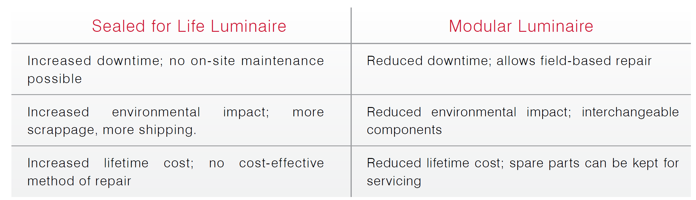 We highlighted earlier that even the manufacturer may be unable to repair a sealed for life luminaire. This issue is amplified for issues not covered under warranty. It means the end-user is more likely to have to pay for an entire replacement, rather than just covering the cost of repair. The expense of this is likely to be significantly larger than the end user would have anticipated.